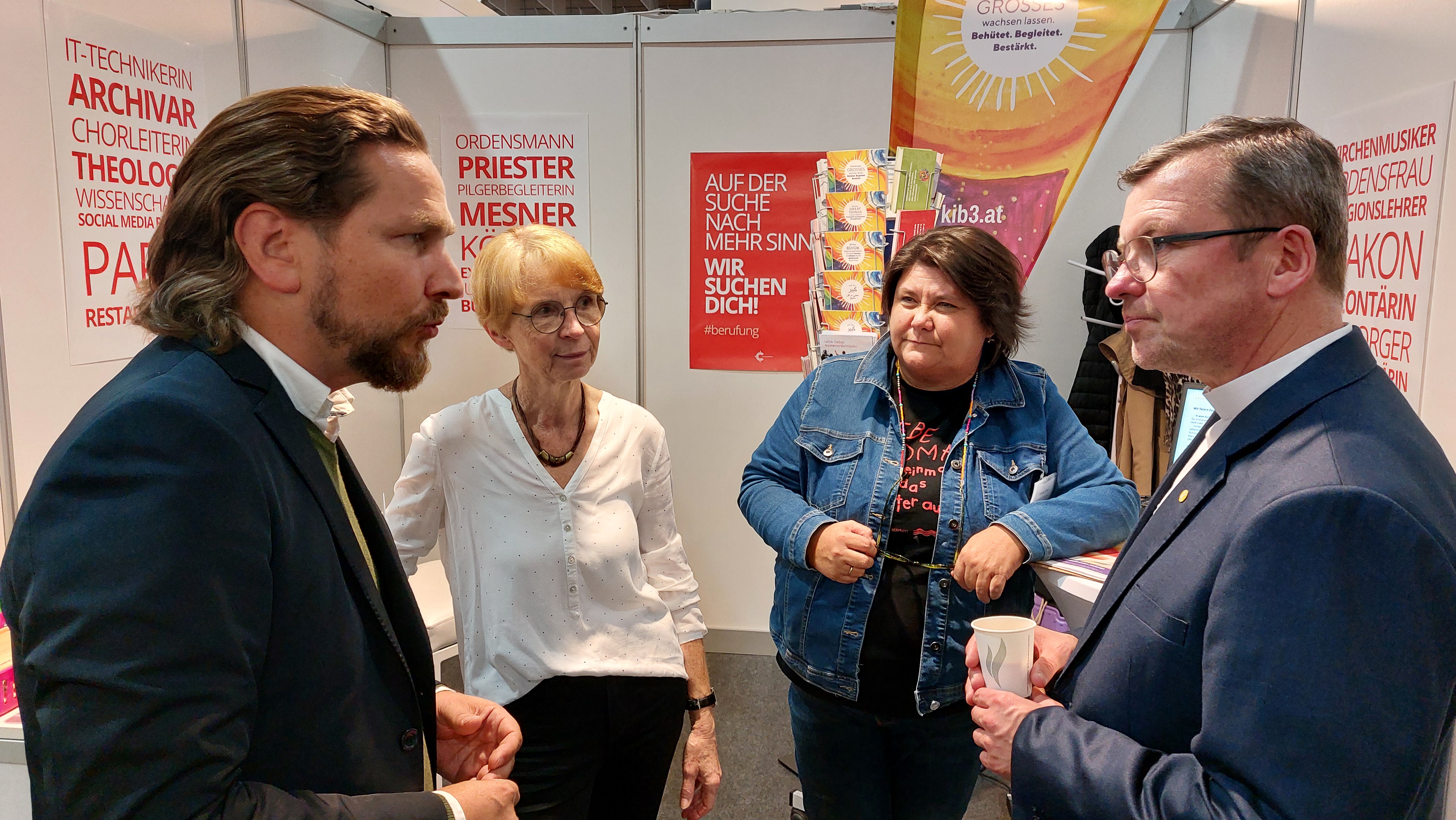 Als eine der größten Arbeitergeberinnen der Steiermark ist es uns wichtig, über die vielfältigen Möglichkeiten, in der Kirche beruflich tätig zu sein, zu informieren. Weihbischof Johannes Freitag und Vertreter:innen des Priesterseminars Graz-Seckau & Gurk, KiB3 - Kinder in Bildungs- und Betreuungseinrichtungen, des Canisiuswerks, der Personalentwicklung und der Berufungspastoral der Diözese Graz-Seckau sind mit Jugendlichen, Lehrer:innen, Eltern und Interessierten über Berufe mit Sinn, konkrete Ausbildungs- und Tätigkeitsfelder und Fragen nach persönlichen Stärken und Interessen ins Gespräch gekommen.